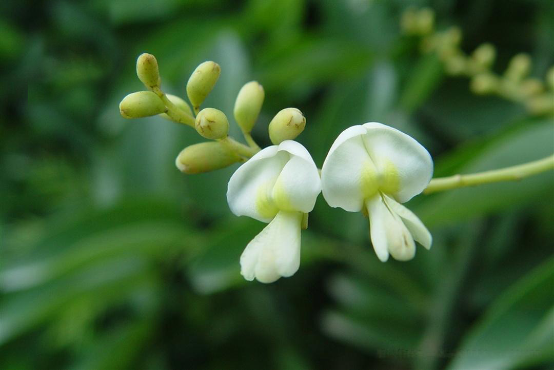 主要特征:羽状复叶长达25厘米;叶柄基部膨大,包裹着芽;小叶4~7对,对生或近互生,纸质;小托叶2枚,钻状。圆锥花序顶生,常呈金字塔形;花梗比花萼短;小苞片2枚,形似小托叶;花冠白色或淡黄色,旗瓣近圆形,具短柄,有紫色脉纹,翼瓣卵状长圆形,龙骨瓣阔卵状长圆形,与翼瓣等长;荚果串珠状,种子排列较紧密,具肉质果皮,成熟后不开裂,具种子1~6粒;种子卵球形,淡黄绿色,干后黑褐色。花期7~8月,果期8~10月。